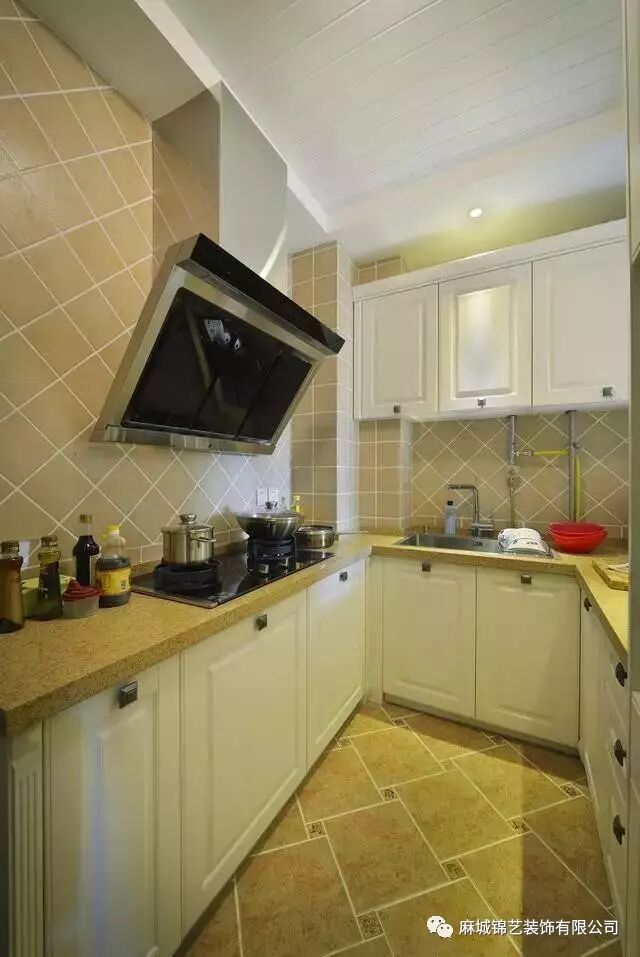 厨房干净清新,墙面用菱形的施工工艺进行装饰,凸显出十足的个性来。