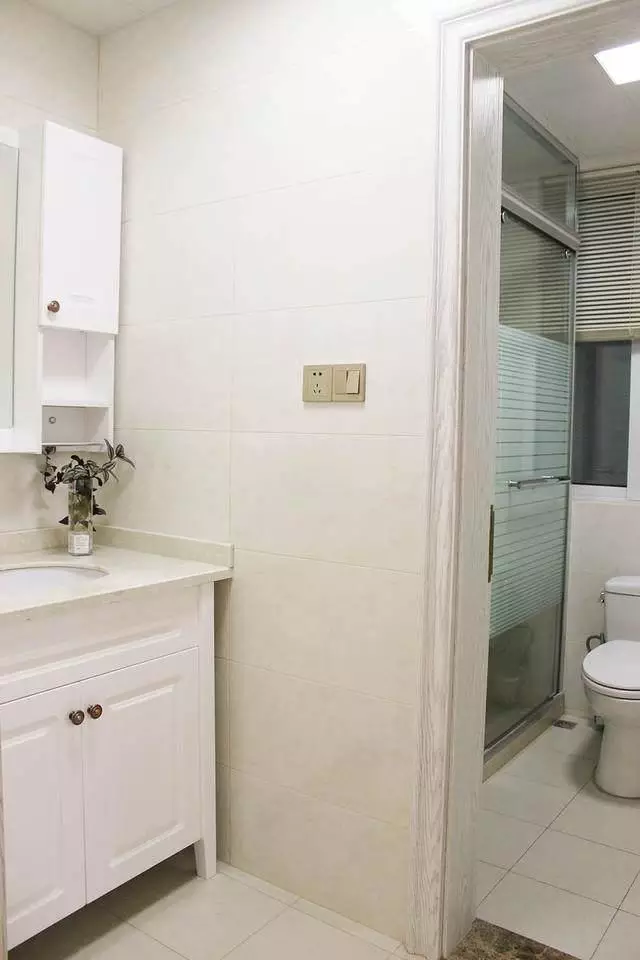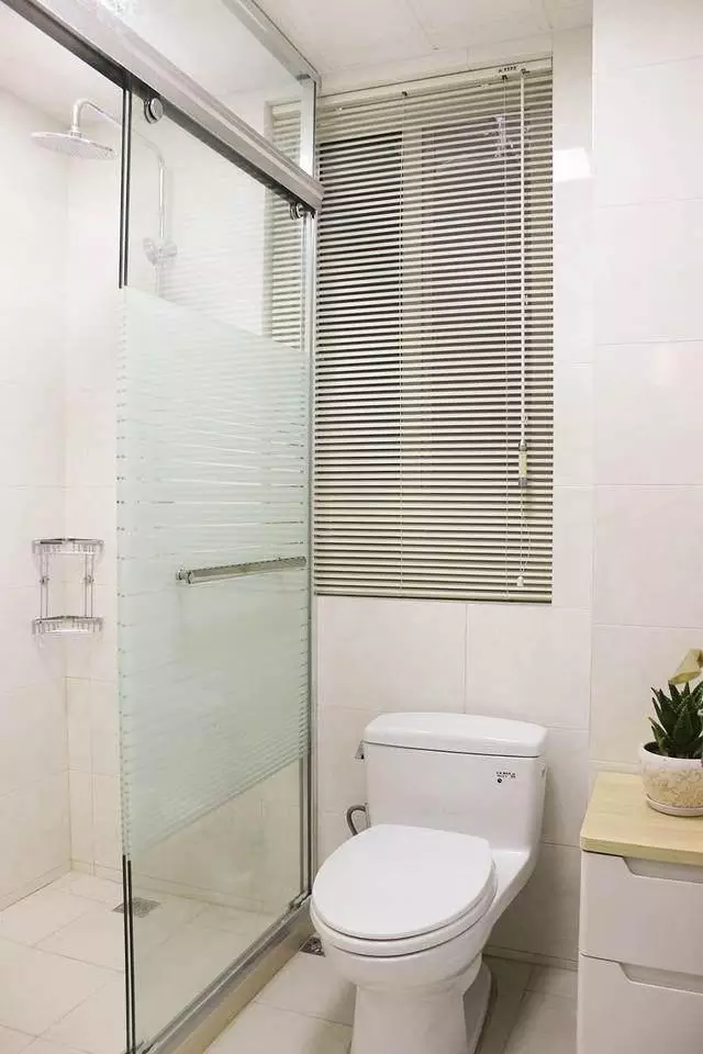 卫生间做了干湿分离,淋浴房用玻璃推拉门做隔断。为了避免早上洗漱与上厕所冲突,特地将洗漱台安装在卫生间外面。