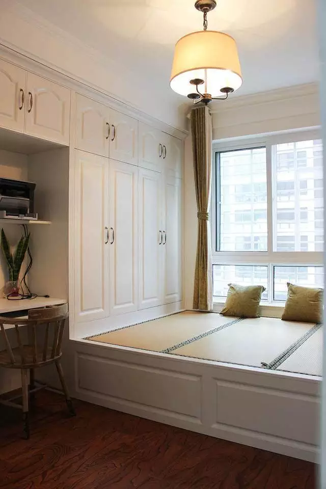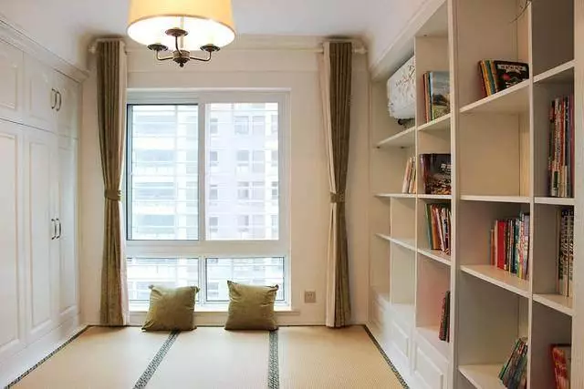 家中两个卧室居住是够了的,因此,这个空间就做成榻榻米休闲区,可以做书房,也可以做客房。而且两边的柜子可以摆放书和储放衣物。