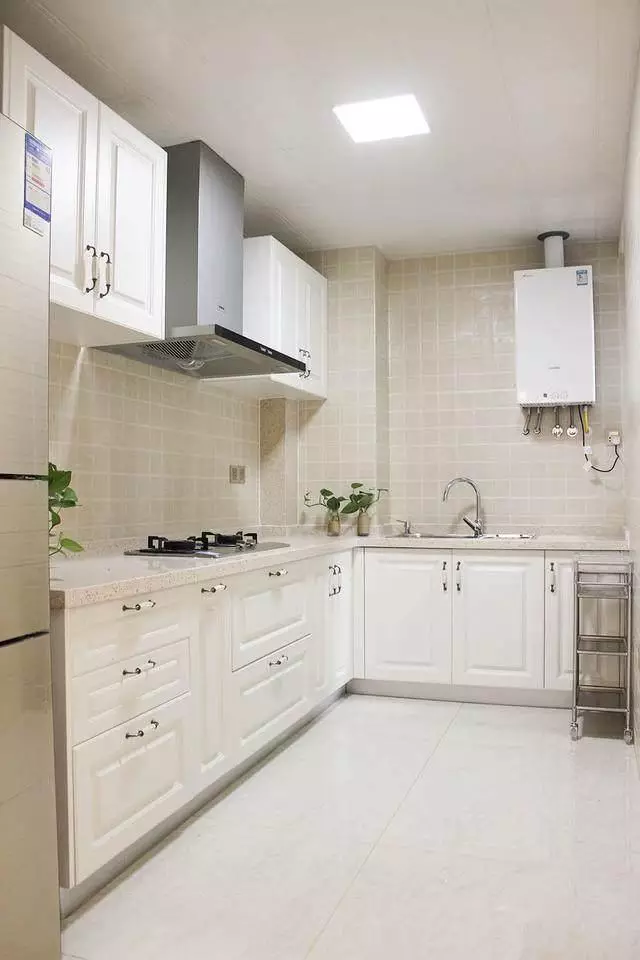 厨房布置比较注重边角空间的利用,从转角的橱柜和冰箱摆放就能看出来。家里的热水器安装在厨房,也是为了安全考虑。