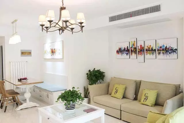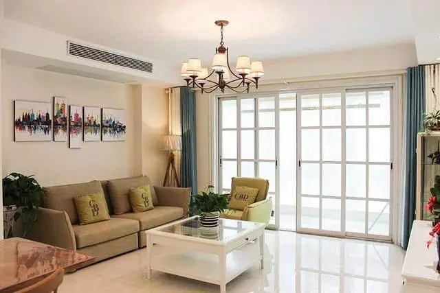 客厅装修和布置都比较紧凑,家具都是根据空间比例来选购的。客厅没有做吊顶,而是采用两排筒灯、简欧吊顶来照明,沙发角落的空间摆放了一盏落地灯,可作为辅助照明用。