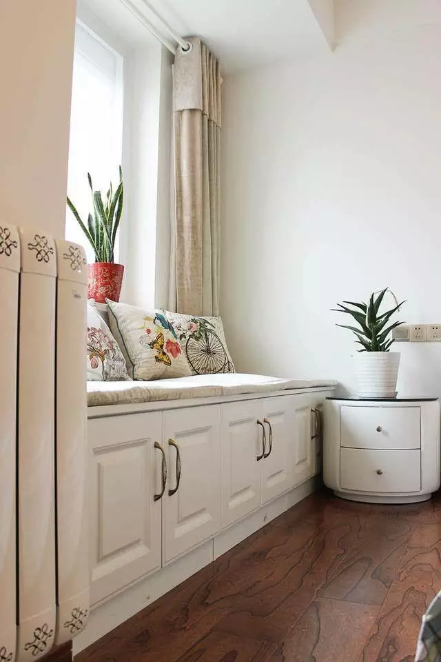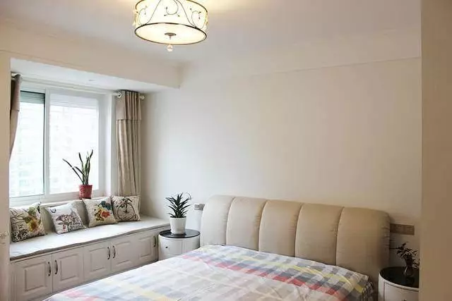 主卧室装修给人舒适、轻松的感觉。大飘窗,满足室内的采光和透气需求,下面的柜子可以收纳,还方便在上面休息。床买的是皮床,舒适又上档次。