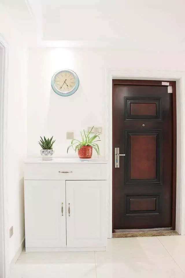 玄关装饰比较简单,精致:落地鞋柜,台面用绿植装饰。墙上挂一个时钟,出门抬头便能知道时间点。