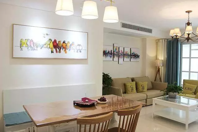 餐厅与客厅是开放式设计,照明都是简欧灯具,客厅与餐厅的装饰画比较有特色,在空间上又相互呼应。