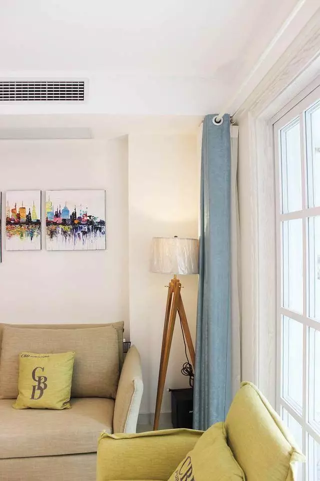 沙发与阳台推拉门的角落也不是一尘不变的边几,而是摆放了落地灯,可辅助室内照明。