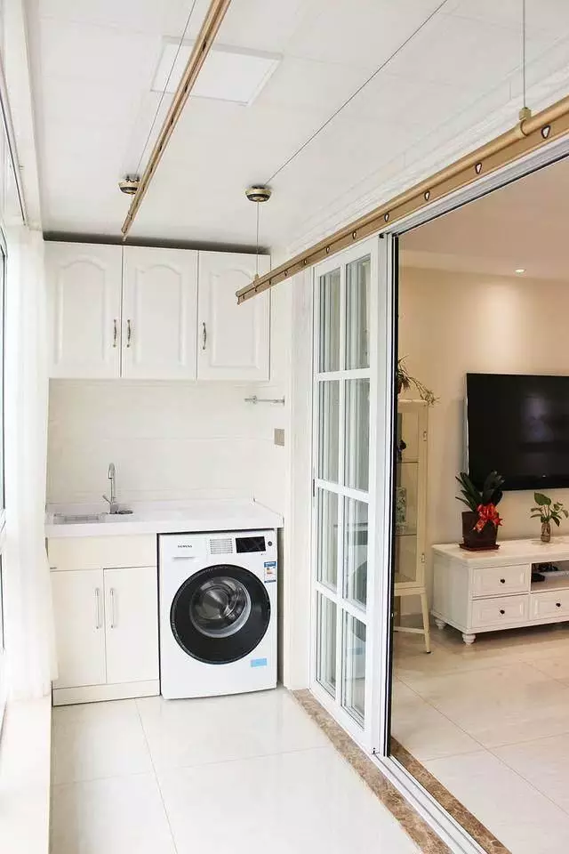 阳台这头做了地柜和吊柜,用来收纳,而洗衣机也塞进地柜的空间里,整齐美观又实用。