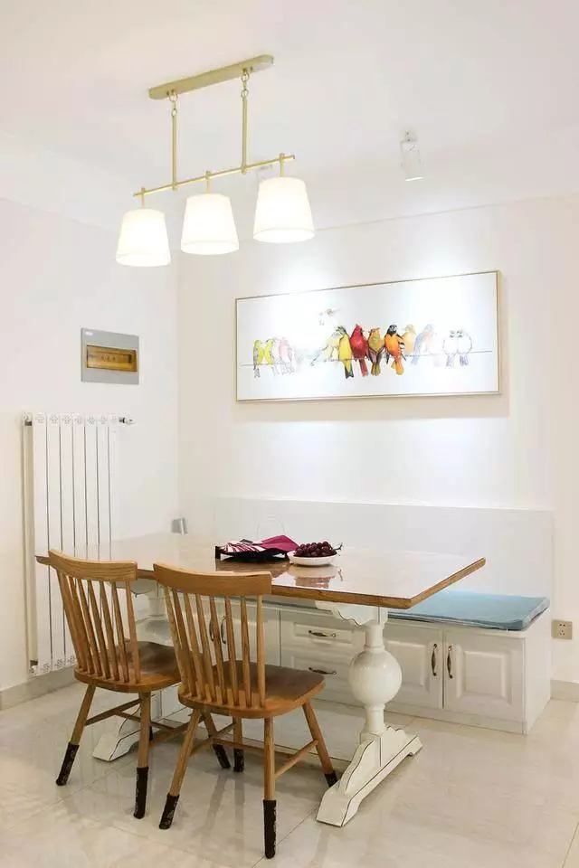 餐厅家具是卡座和餐桌凳相结合,可节约室内空间。卡座下面做成柜子,可加强餐厅的收纳。