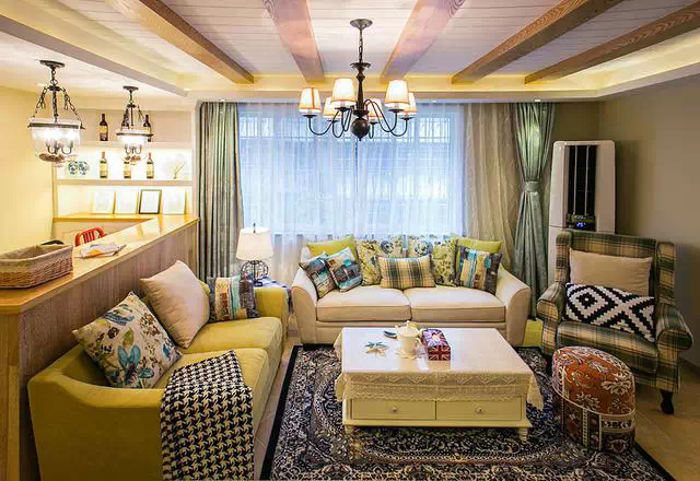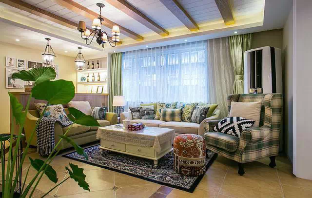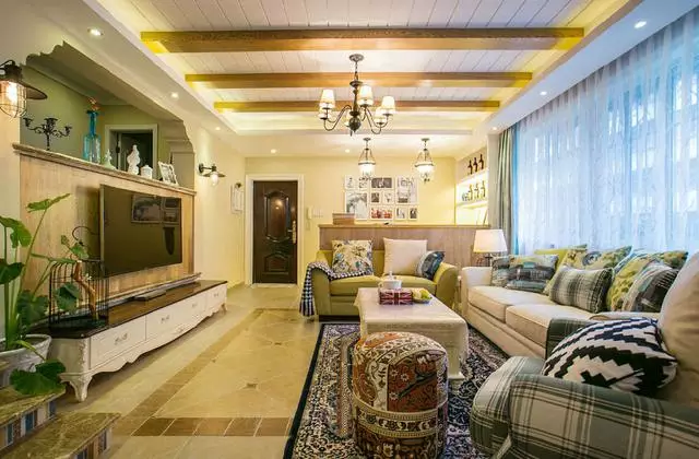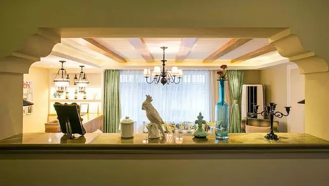 客厅,木梁配合白格栅的吊顶是美式的经典特征,加上垭口拱门的设计,将美式风格体现的淋漓尽致。