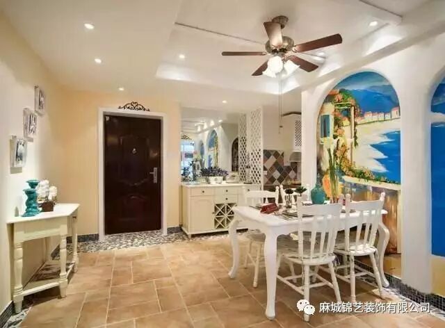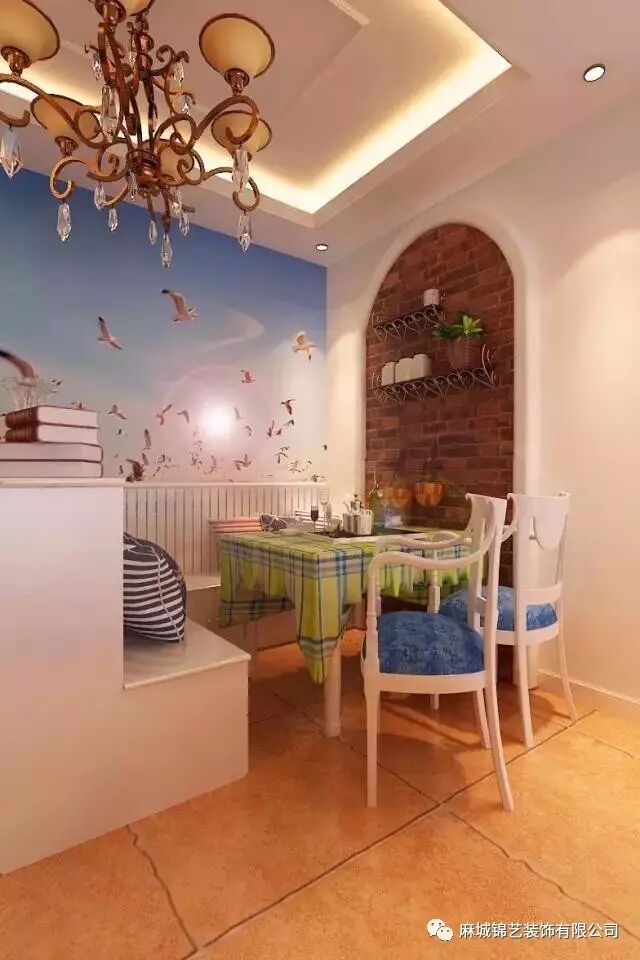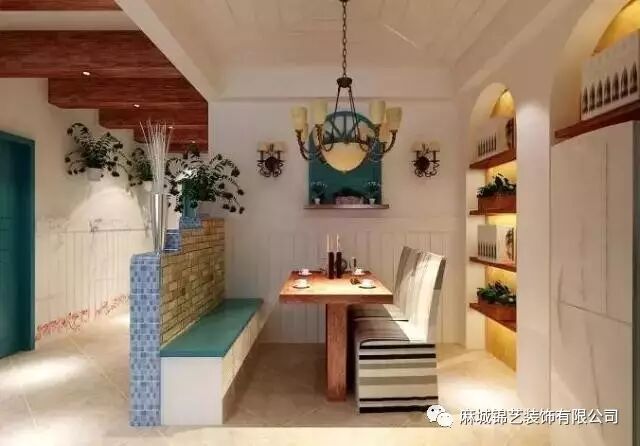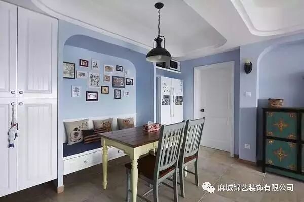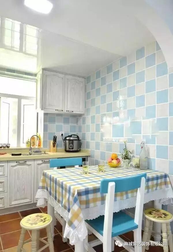 蓝白相间的墙壁,蓝白黄三色格子桌布,清新、自然的田园风情扑面而来。