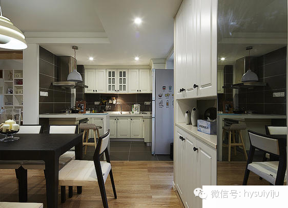 一个小吧台在现代家居里是绝对少不了的。一张高脚凳子,在这样的开放式备餐时,还能与家人进行交流,同时还可以照看着孩子。开放式的设计,会让空间显得更为开阔不拥挤。