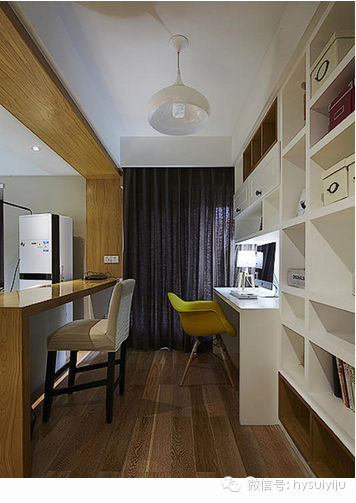 书房的设计更是一个杰作,白色收纳式书桌,一个小吧台便是书房与客厅的一个小隔断。书房的双重性使其在家庭环境中处于一种独特的地位。