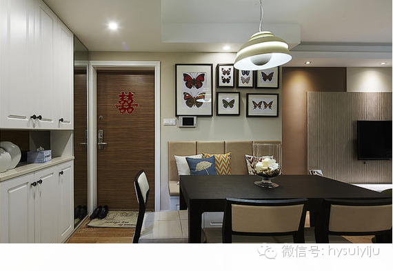 餐厅,进门玄关右手边是一面镜子,从视觉上延生了客厅与餐厅的空间。左手边是极具收纳功能的储物换鞋椅,没有把它单独做一张换鞋椅,而是把背景墙装饰了一番。几张蝴蝶相框墙,让玄关区也成为一道亮丽风景