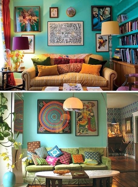 蓝绿色与黄色搭配,穿插黑色调和空间;花布配基里姆格几何图形地毯,丰富布艺元素与色彩层次,清新脱俗的气质浑然天成!