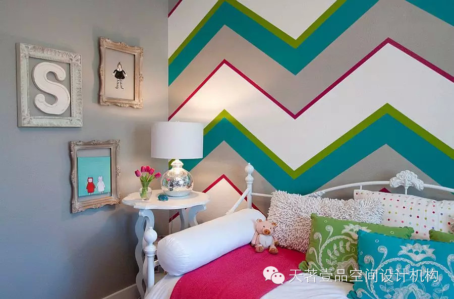 不只是只有奶油色、米色和白色的条纹背景墙才能塑造趣味性。如果你觉得传统的条纹设计太乏味了,可以添加一些孩子们喜爱的图案比如锯齿状,为儿童房创造更多的视觉趣味和异想天开的魅力。
