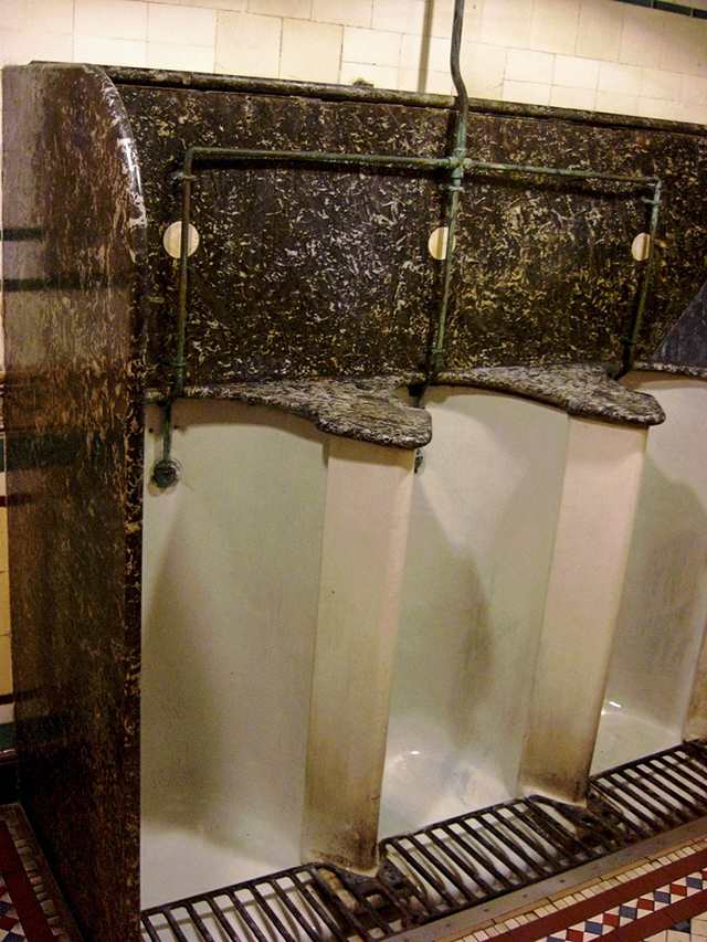 酒吧同时拥有伦敦最年长的卫生间。与现代便池不同的是,维多利亚时期的英国绅士,即便如厕也不忘保护隐私,黑色大理石与白瓷砖围起半人高的空间,保证空间封闭性。同时,在现代卫浴中出现的越来越少的黑色大理石,透露着维多利亚时期的高贵气质。