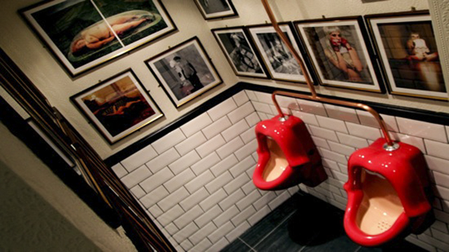 Hippodrome位于热闹的Leicester 广场上,是一家赌场。卫生间在天鹅绒质感的大红色墙纸以及同色软座的衬托下富丽堂皇,然而奢侈的装潢并非厕所引起人们注意的原因。