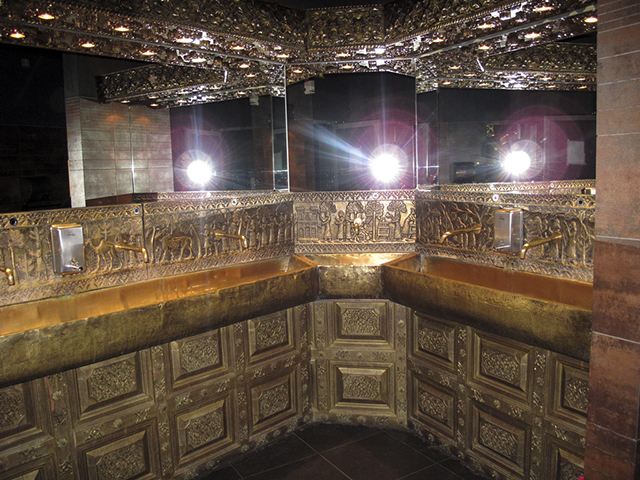 走进Gilgamesh的卫生间,暗橘色的墙体创造奢侈的室内空间,盥洗台被刷上质感金漆,像极了真金。除此之外,雕着骆驼、身着古服的巴比伦人像的浮雕镶在水台与镜子之间,天花板也错落地安装上复杂繁复的花样雕饰,令人诧异是否错入史诗记载的皇家浴洗室。