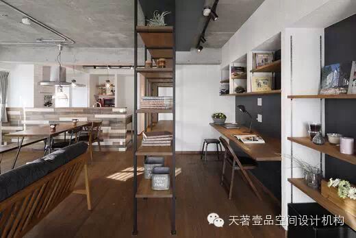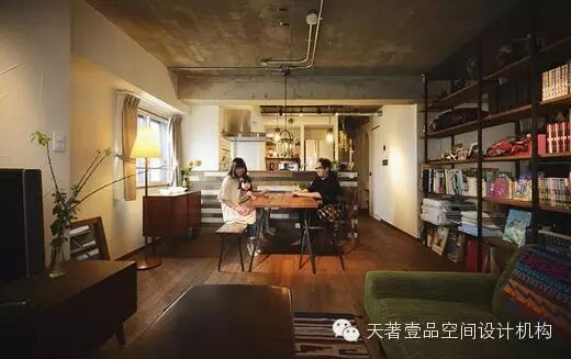 东京的一对夫妻在有了孩子后,搬入面积较大的这间二手房,但原本三房的格局造成各个空间压缩狭小,因此 LOHAS Studio 拆除了位于客厅旁的和室,并用铁件和橡木集合层板制作开放式书架,将之作为轻隔间,创造后方的工作区。若夫妻两人都有工作,只有一张餐桌可能会不敷使用;有了工作区,父母其中一位在餐桌陪伴孩子时,另一位就能在书桌专心工作,并且因为隔间是通透的书架,因此能互相照应。另一方面,屋主喜欢带有一点粗犷感觉的复古氛围,水泥天花及裸露管线先主导了这个方向,并将开放式厨房的半隔间添上仿旧木料、以白磁砖和不鏽钢流理台带出工业风原始素材的味道,而深色木地板、原木家具和温暖灯光、绿色植物,则负责营造三口之家温馨怀旧的气氛。
