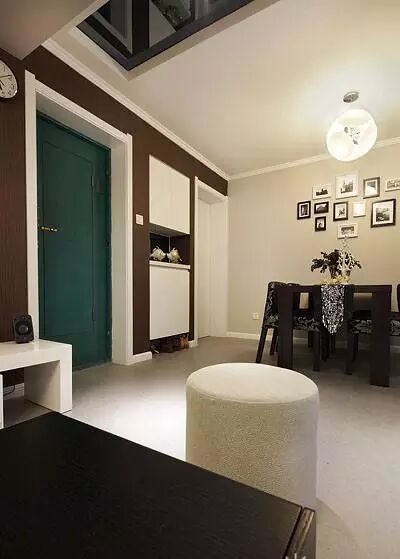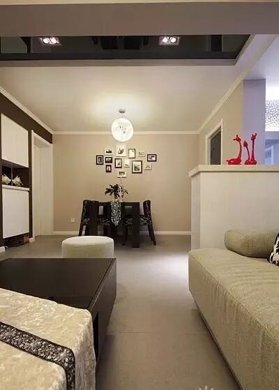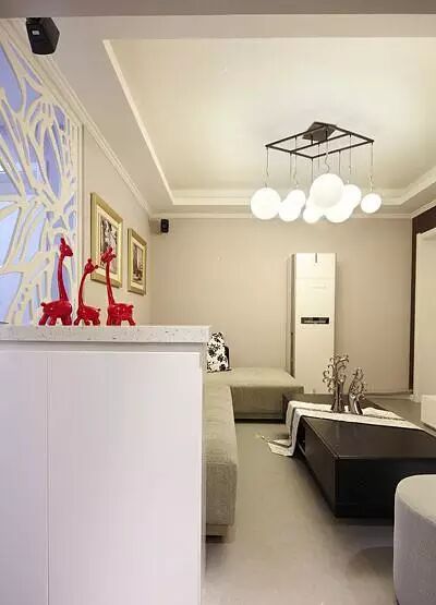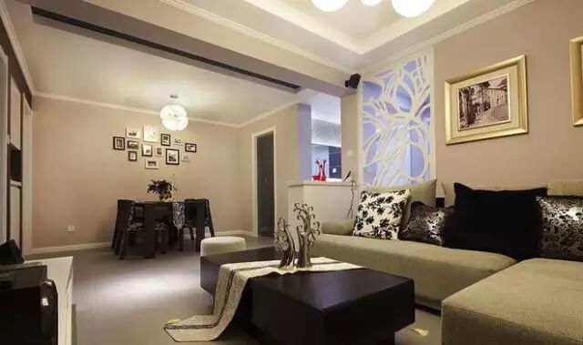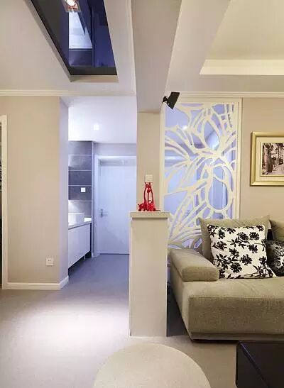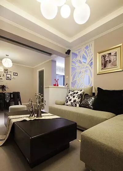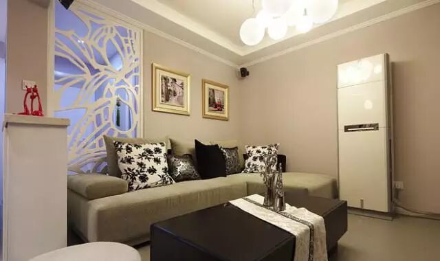 因为本户型实用面积72平米,因而设计师在设计时重视整体完整性,充分利用空间,减少隔墙,用一个镂空屏风做间隔,非常美观。