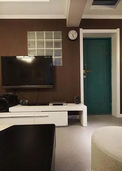简约个性的电视背景墙没有做过多的设计,咖啡色的墙纸和整体空间的色彩搭配起来十分的和谐,不抵触。