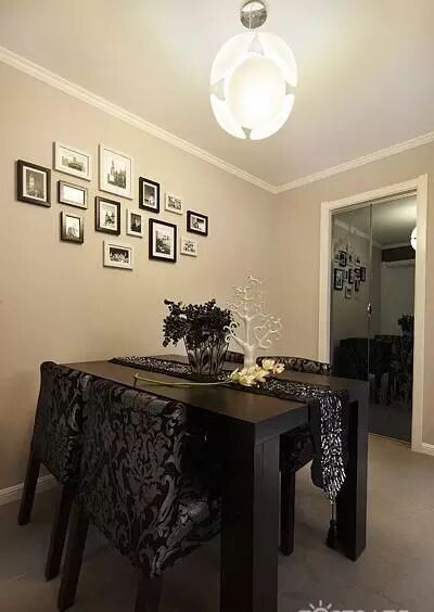 黑色餐椅配上银色斑纹,尽显低沉豪华。餐厅的相片墙设计,彰显主人的时髦品位。