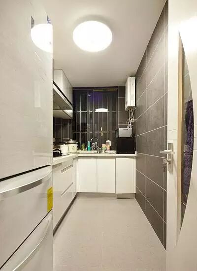 一字型厨房,也是以是简约色彩为主。挑选灰色墙面看起来对比耐脏。