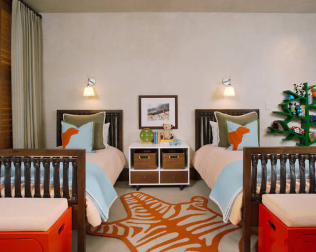 在岁龄较小的儿童房间里,可以在床尾增加一个小木椅子,防止孩子滑落。