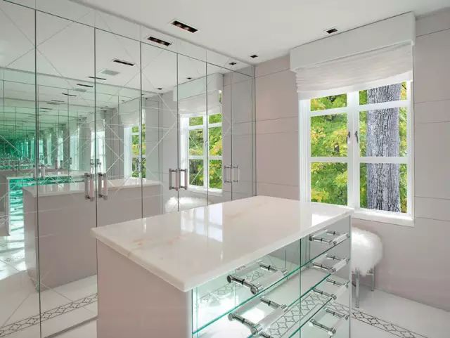 如果你有更多的空间,中间岛的设计让你再次完美展现你的小饰品,岛屿有各种各样的形状和尺寸。但要确保足够的储存抽屉和架子,实现最大化利用。在中间岛上放一些篮子或盘子展示小物品,如珠宝,钥匙等等。
