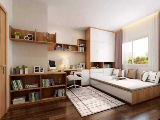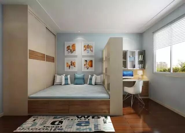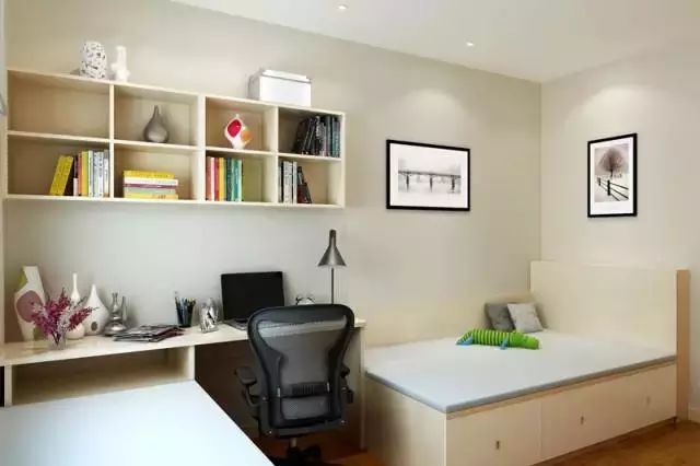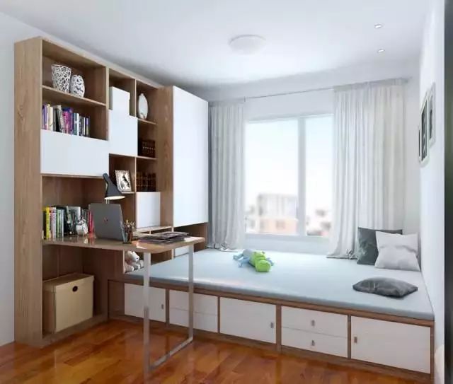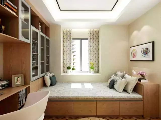 榻榻米跟书柜的结合,床头一排矮柜用处可大,可做床头柜,里面可收纳,还能做装饰。