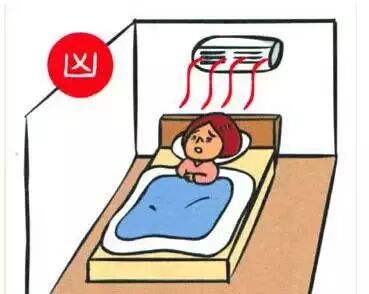 床位安置在空调下方,睡眠时毛细血孔张开,寒气不断吹向头、肩、颈,轻者经常感冒,重者会造成肌肉僵化。
