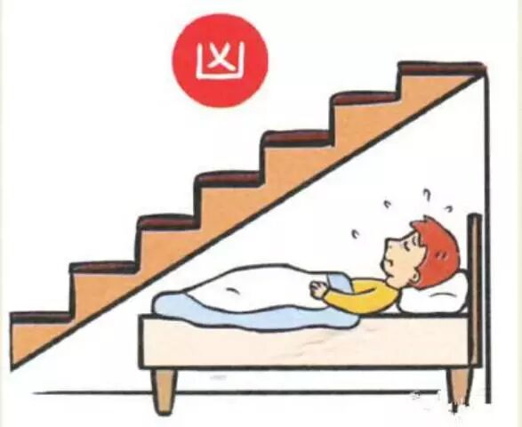 床在楼梯下方,睡在床上的人会因为压抑的空间感而导致呼吸不畅、睡眠不足,经常恶梦不断。