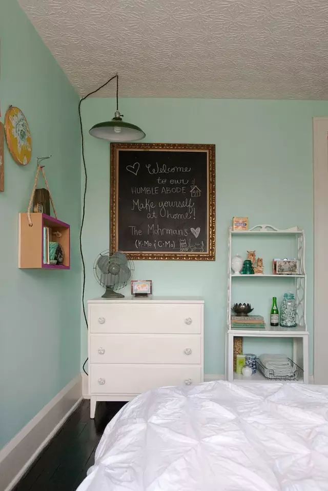 有些人可能误以为黑板墙只能用黑色,其实不然。要不你试一下用绿色或淡黄色,会有不同的效果哦。同样的,黑板也不仅仅是挂在墙上,它还可以放 在你的床头上方,作为一幅床头画的存在呢。
