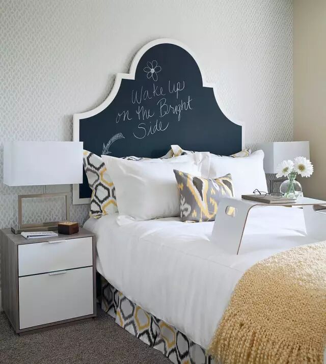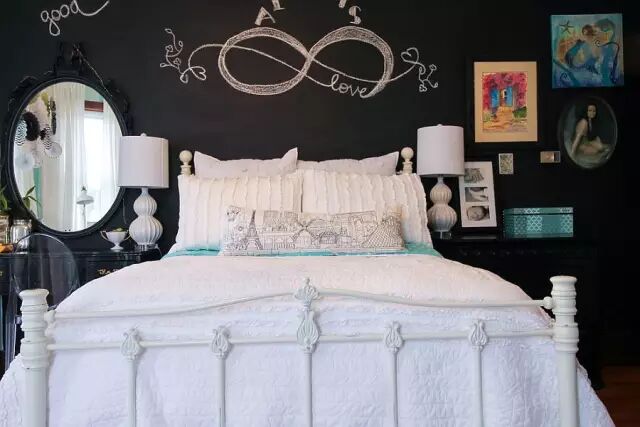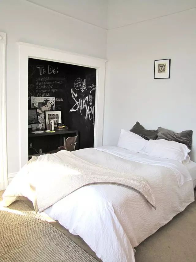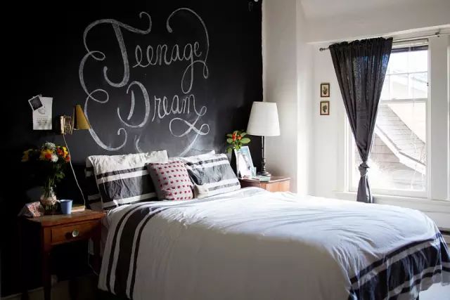 现在人们喜欢把它做为床头画的一种形式,而如果你房间本来就是那种轻松 、舒适的中性色调,设置一幅黑板墙会让房间锦上添花。很快你就会发现你房间的重点,再也不是那一大堆的励志名言,取而代之的是你的黑板上那一大片的灵感一瞬间和那些搞笑的二逼涂鸦。