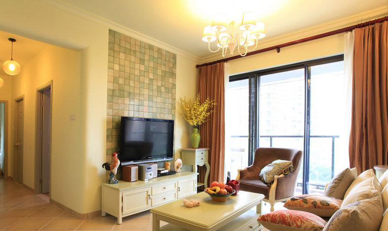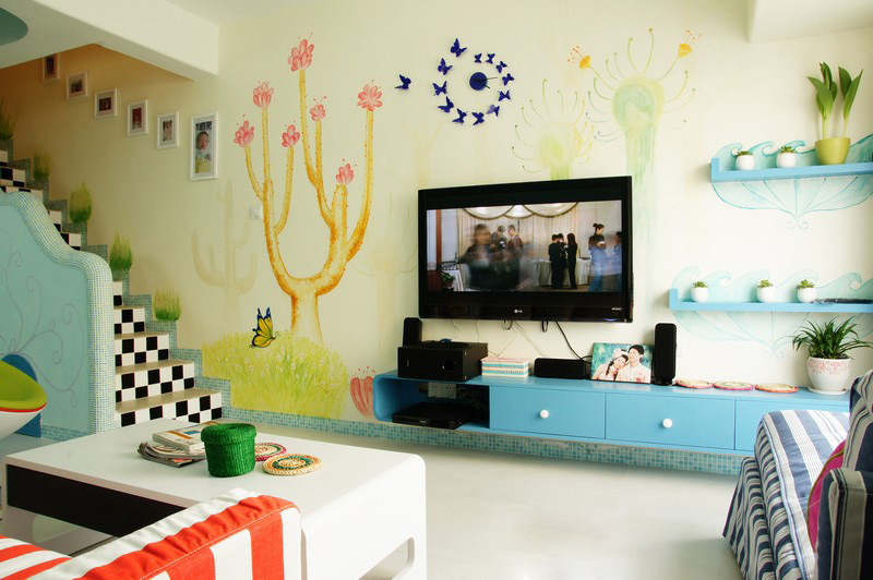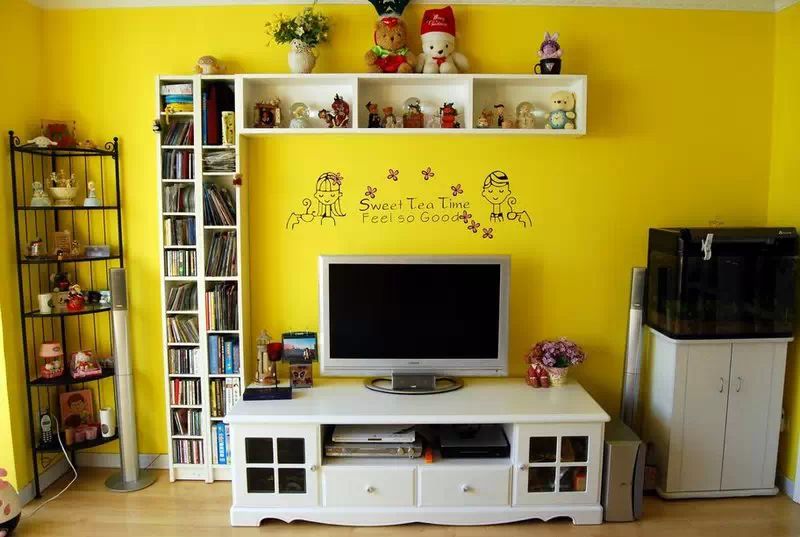 黄色乳胶漆配合电视柜以及收纳书架,另外用可爱墙贴点缀