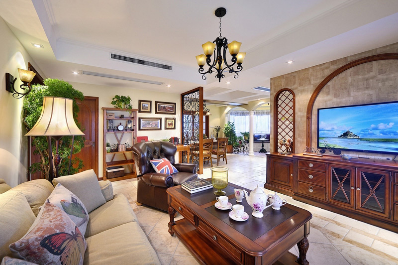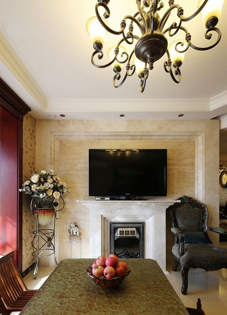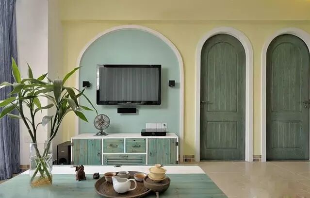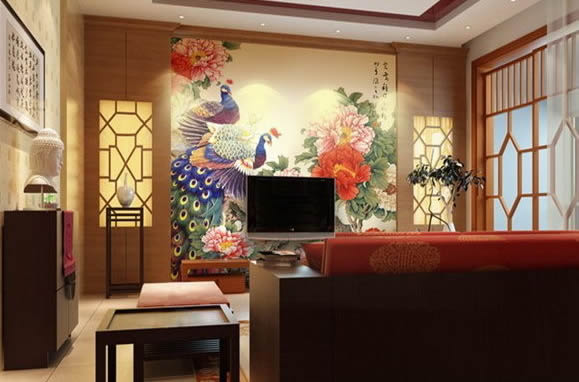 用一整画作为电视背景,可以是手绘、壁画、吊顶画等各种材料