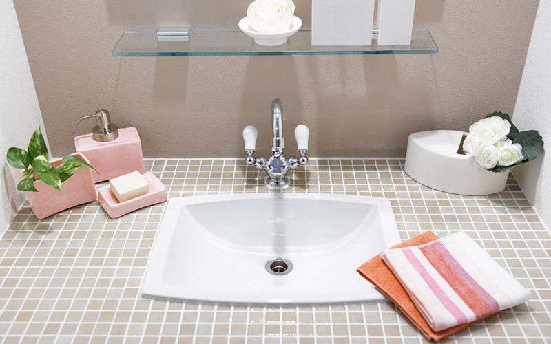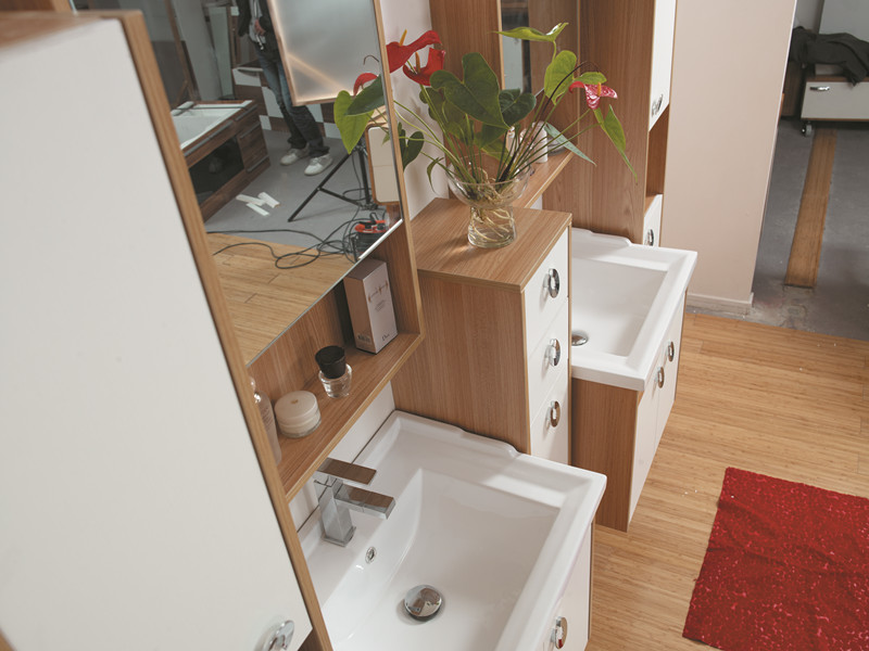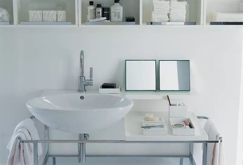 放过多的清洁卫生用品都会显得杂乱无章,而且容易碰倒,因此不妨在面盆上部贴墙的位置钉上搁板,只要能放得下化妆瓶、刷子、洗漱杯等就可以了。搁板高度以不妨碍使用水龙头为宜,材料可选用木板、玻璃等。