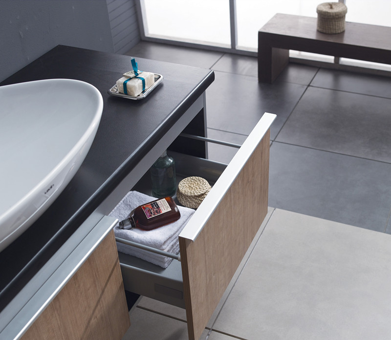 洗手台区域是浴室中使用频率最高,零碎物品最多的地方。在洗面盆上方设置吊柜,下方安置地柜,旁边还可以安置挂杆,这样的方式能充分地利用洗手台四周的墙面。
