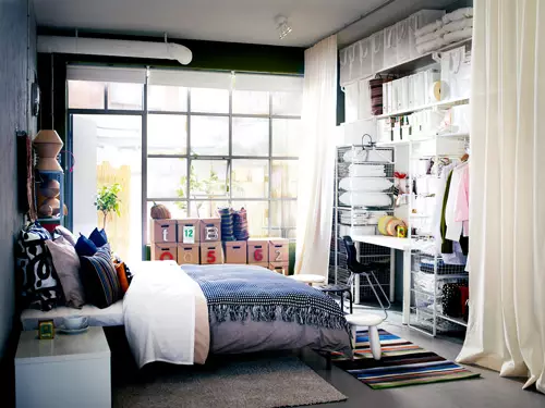 对于小户型来说床下空间永远不能忽视,只需增添几个带盖的储物箱,换季下来的棉衣、鞋子等就都有安置之处。