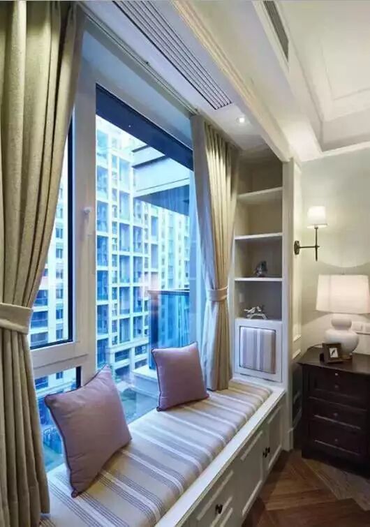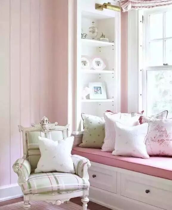 浅灰色和粉色的搭配绝对是小清新啊,窗台上摆满书再养几盆喜水的小绿植,客厅绝对高颜值啊。