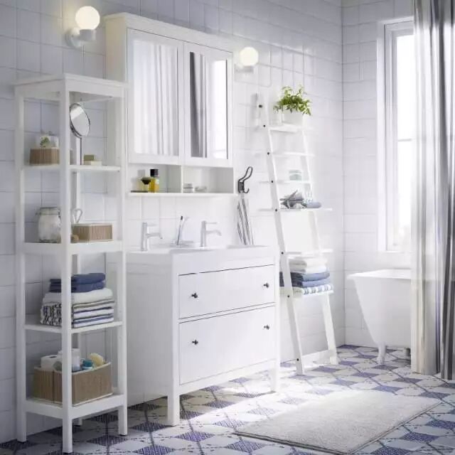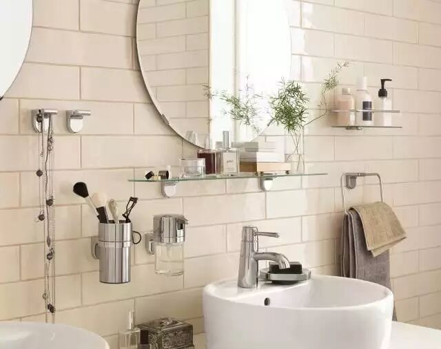 如果嫌浴室东西太多容易乱,干脆像这样摆两把架子,一切都整齐了。