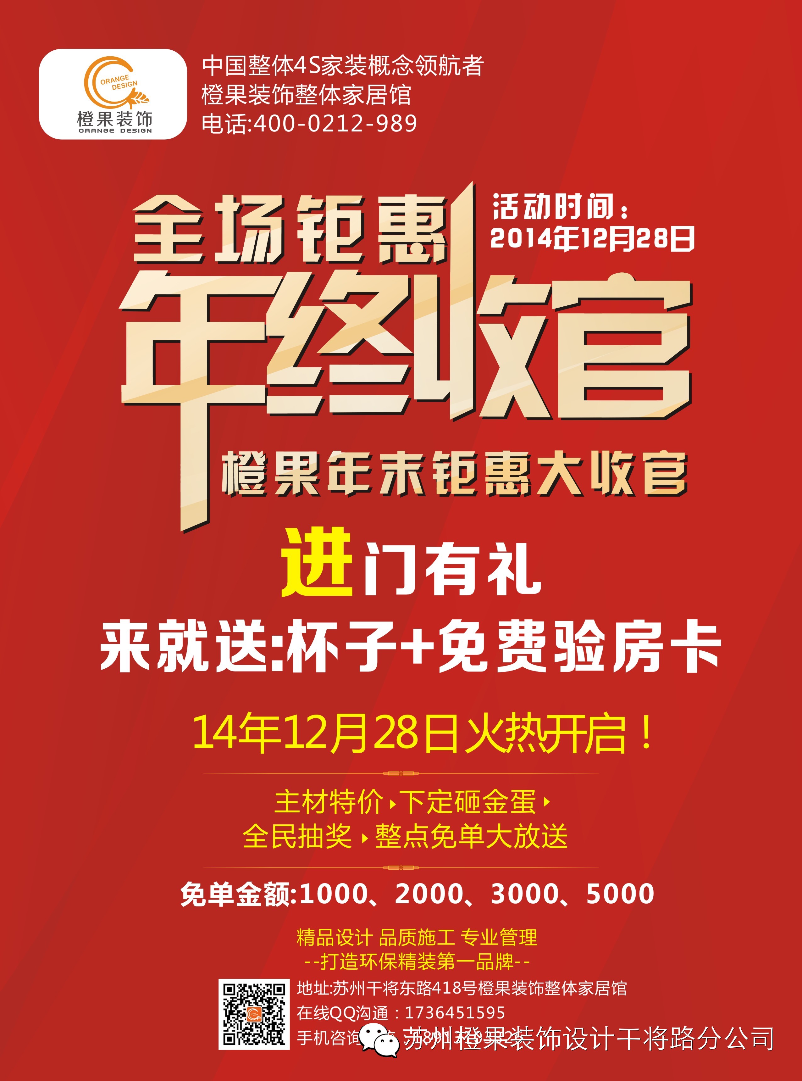 即日起至28日只要您微信报名参加12月28日橙果装饰年终大收官活动,签订合同微信客户专享豪礼,快快奔走相告吧~错过今日要等1年哦!