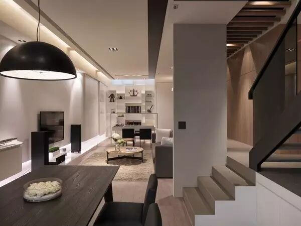整体上装饰得中性而优雅,呈浅灰色。比如木地板、地毯、壁纸以及主要家具等。房间采用了多层次布局,通过一部楼梯连接。悬浮式储物架设计得很有特色,配合柔和的灯光,显得非常温馨。