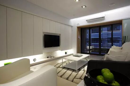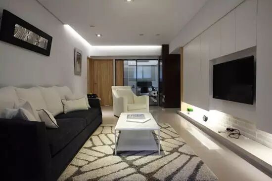 位于电视正上方的梁,设计师以柜子修饰,并满足公共空间的家居收纳。