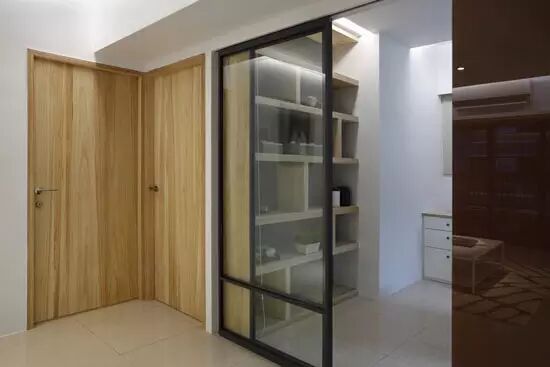 与公共空间连结的元素:梧桐木,仿佛是由门外转折入书房,成为不对称的展示收纳柜