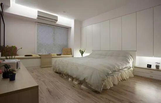 运用梁下产生的空间做足床头柜,延展至两端的平整设计,令人忽略大面积柜子的压迫度,甚至连窗边也以休闲卧榻的形式,将收纳空间藏于下方。