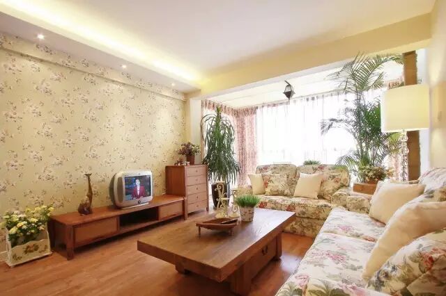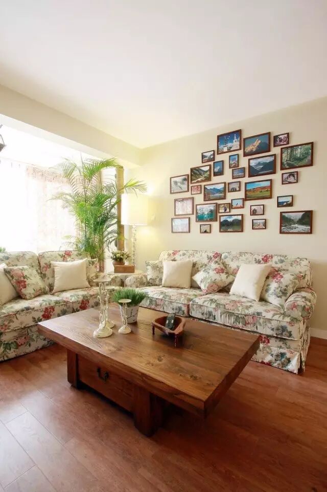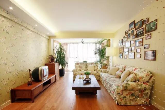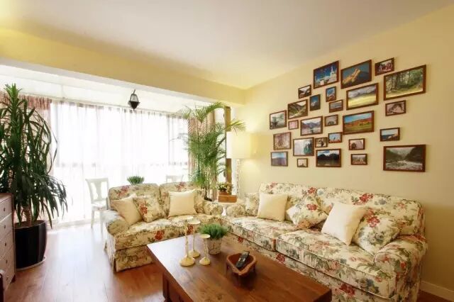 1.▲ 暖暖的淡黄色墙面,碎花布艺沙发,浓郁田园风