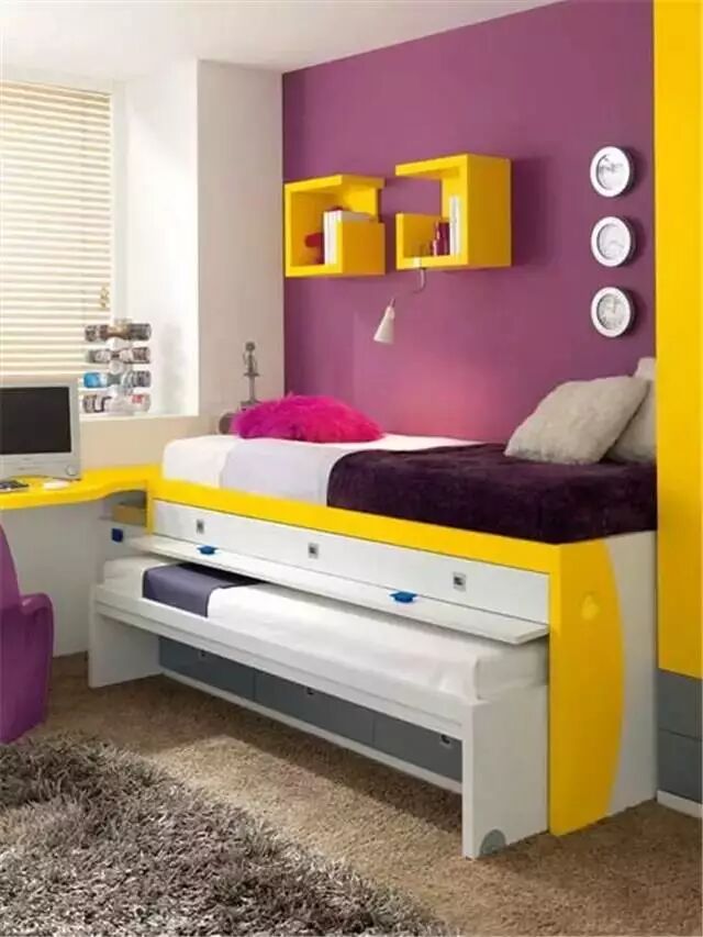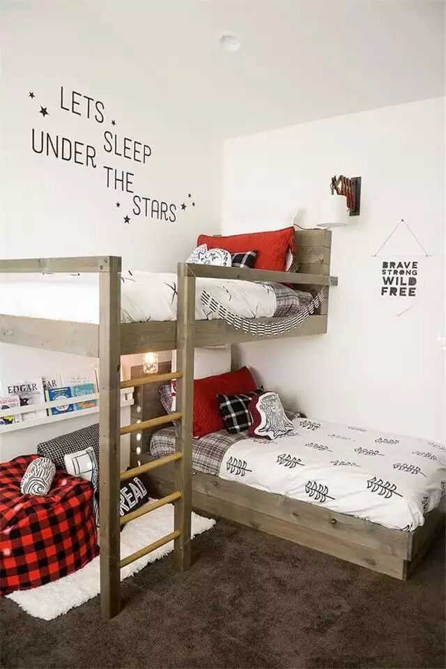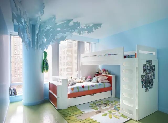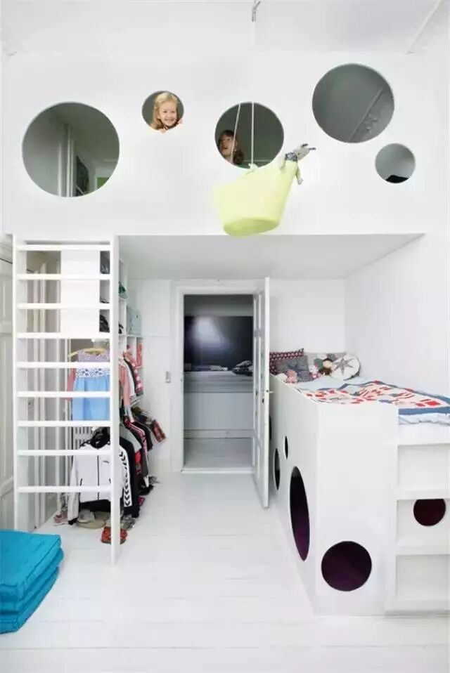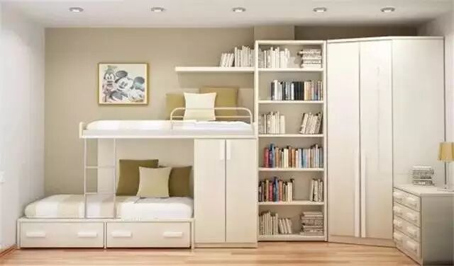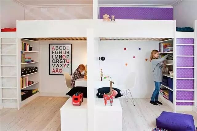 传统的上下床显得呆板,选择这种错落设计,不仅能让宝贝们多一点乐趣,少一份压抑,还能增强两个宝贝的沟通互动,培养感情。这种上下床还可以把书桌、书柜、衣柜一体化设计,增大储物功能,绝不浪费半点空间,只此一间的儿童房实现了更多功能。