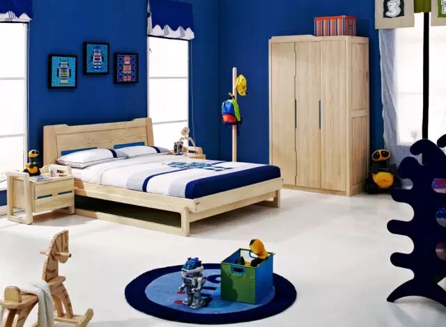 儿童房内部的颜色对小孩的心态也有很重要的影响,首先色泽要淡雅,不可用太刺眼的大红大紫色,避免刺激小孩,也忌用黑色及纯白色,而用淡蓝色为底点缀一些草绿、明黄、粉红的色泽则较好,能取得和谐的效果。