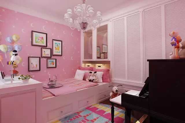 儿童房在稚气可爱的风格下,仍然保留着简欧元素,纯白的衣柜,欧式的吊灯等等。