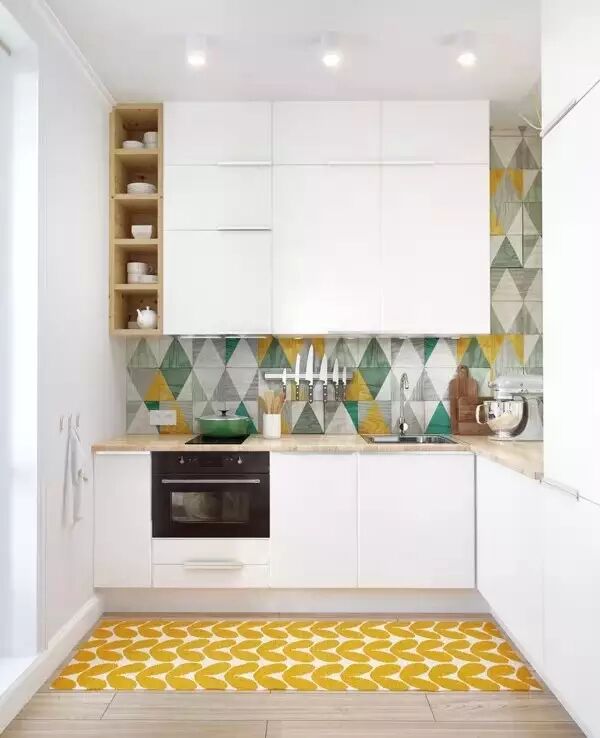在对面,是厨房墙面和白色存储柜。虽然很小,但厨房意味深长上的挡板、地板上的亮黄色垫子以及墙上五彩的瓷砖都是亮点。